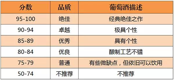 美國的《葡萄酒與烈酒》(Wine & Spirits)雜志是世界上最權(quán)威的葡萄酒雜志之一。自 1994年起,《葡萄酒與烈酒》也開始采取百分制對葡萄酒進(jìn)行評分,葡萄酒首先會經(jīng)過一些葡萄酒專業(yè)人士進(jìn)行初次品嘗篩選,之后才會送到專業(yè)“評酒團(tuán)”品評,所以該雜志評分的葡萄酒品質(zhì)都不錯。評分標(biāo)準(zhǔn)如下所示: