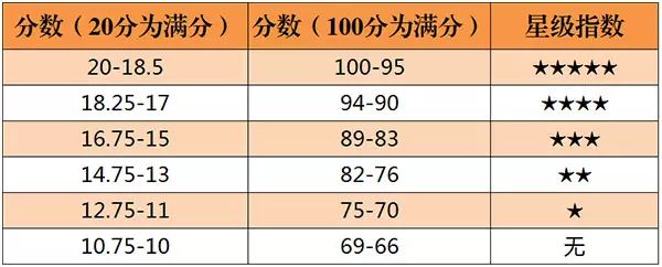英國的《醇鑒》(Decanter,簡稱 DE)雜志始創(chuàng)于 1975 年,是一本專門介紹世界葡萄酒及烈酒的專業(yè)雜志。由于英國幾乎不生產(chǎn)葡萄酒,加上其王室在歐洲的崇高地位,大眾普遍認(rèn)為英國對葡萄酒的評分會更客觀公正,因此《醇鑒》雜志在英語國家有著很大的影響力。該雜志評分采用 20 分制,0.25 分為最小單位,提供百分制換算,同時有從 0 星級到 5 星級的推薦規(guī)范: