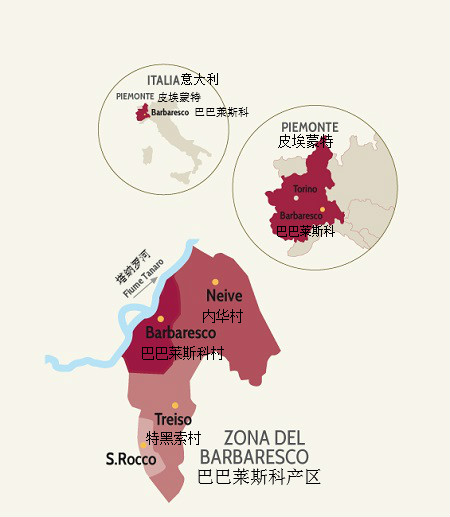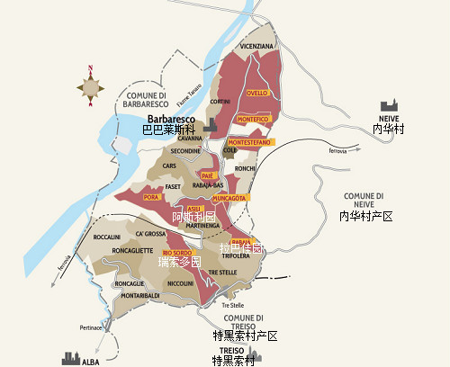 巴巴萊斯科的葡萄園面積僅為巴羅洛的1/3,主要分布在巴巴萊斯科村、內華村(Neive)和特黑索村(Treiso)三大著名村莊內。因地理位置不同,這些村莊的風土條件略有差異:巴巴萊斯科村緊鄰塔納羅河,氣候比較溫和;內華村土壤類型多樣,除了鄰近巴巴萊斯科村的葡萄園之外,這里大部分葡萄園的土壤富含沙石;而特黑索村在高海拔和森林的調節(jié)下,氣候最為涼爽。
