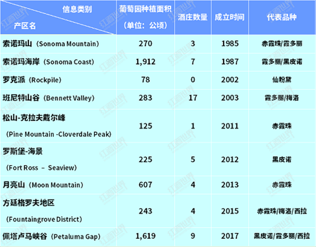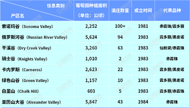 索諾瑪縣擁有多達(dá)17個AVA子產(chǎn)區(qū),每個產(chǎn)區(qū)都擁有自己獨(dú)特的歷史、地理?xiàng)l件和代表品種,以下兩個表格是索諾瑪縣子產(chǎn)區(qū)的基本信息概況。