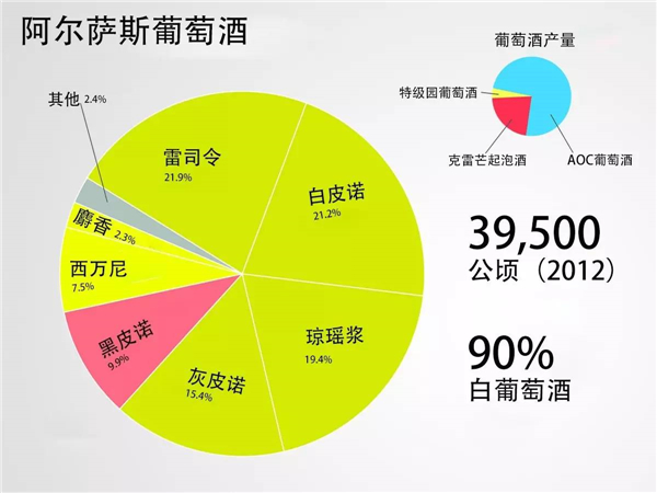 阿爾薩斯產區最尊貴的葡萄品種是雷司令(Riesling)、灰皮諾(Pinot Gris)、瓊瑤漿(Gewurztraminer)以及麝香葡萄(Muscat)。阿爾薩斯的葡萄酒通常口感濃郁,帶有礦物質味,并不是這些葡萄品種一般擁有的清新果味。