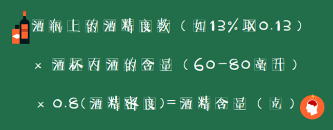 大家常飲用的葡萄酒度數(shù)一般為11 - 13%,按照不超過(guò)酒杯1/3的倒酒標(biāo)準(zhǔn),一杯葡萄酒通常有60 - 80毫升。按下圖計(jì)算公式,喝一杯葡萄酒,你將攝入5 - 8克酒精。