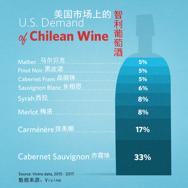 近年來,由于國際需求上漲,智利的葡萄酒行業發展勢頭迅猛。雖說現在智利標志性的葡萄品種依然是佳美娜,但由于國際上對赤霞珠的需求日益旺盛,在出口到美國的葡萄酒中,采用佳美娜釀造的實際上只占了17%,而最近頗受歡迎的赤霞珠葡萄酒則占到了總出口量的近三分之一。此外,梅洛和西拉的市場份額占比都略高于8%。