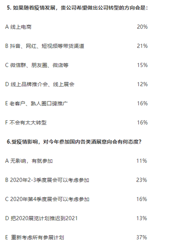 5. 68%的企業(yè)對線上形式的轉(zhuǎn)型方向感興趣,包括:線上電商、抖音、網(wǎng)紅、短視頻微、信群、朋友圈、微店、線上品牌推介會、線上展會等渠道。
