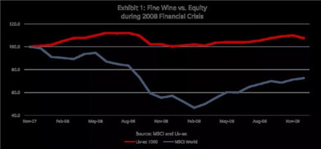 精品葡萄酒投資公司Cult Wines近日也發(fā)布了一份關(guān)于精品葡萄酒投資的統(tǒng)計(jì)分析報(bào)告,報(bào)告稱在2007年11月至2009年11月的整個(gè)金融危機(jī)期間,Liv-ex 1000指數(shù)的表現(xiàn)始終優(yōu)于摩根士丹利資本國際全球指數(shù)(Morgan Stanley Capital International Index,簡稱MSCI指數(shù),是一個(gè)市值加權(quán)股票市場指數(shù))。