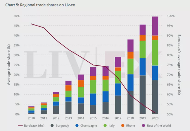 一些新的區(qū)域如布魯奈羅、巴羅洛、香檳也吸引著買家的注意。今年到目前為止,波爾多葡萄酒的貿(mào)易份額為51%,勃艮第17%,意大利13%,香檳7%,羅納河谷2%。世界其他地區(qū)的葡萄酒價格已經(jīng)從最近的平均5%上升到10%,部分原因是受到了來自新世界的免稅葡萄酒的推動。