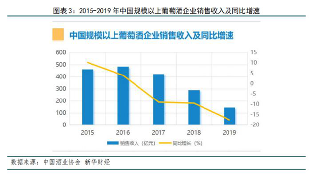 2019年,全國規(guī)模以上葡萄酒企業(yè)數(shù)量155家,銷售收入145.09億元,同比減少17.51%;實現(xiàn)利潤總額10.58億元,同比降低16.74%。2020年第一季度,銷售收入18.95億元,下降44.02%;利潤0.01億元,下降99.24%。全國葡萄酒行業(yè)規(guī)模以上企業(yè)經(jīng)濟效益在2019年本就低迷的情況下,受新冠肺炎疫情影響,在2020年第一季度顯得更加慘淡。