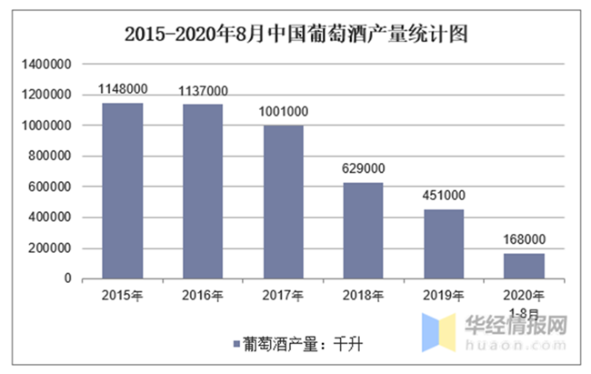 華經產業(yè)研究院數據顯示:2020年8月中國葡萄酒產量為21000千升,同比下降22.2%;2020年1-8月中國葡萄酒產量為168000千升,同比下降28.8%。