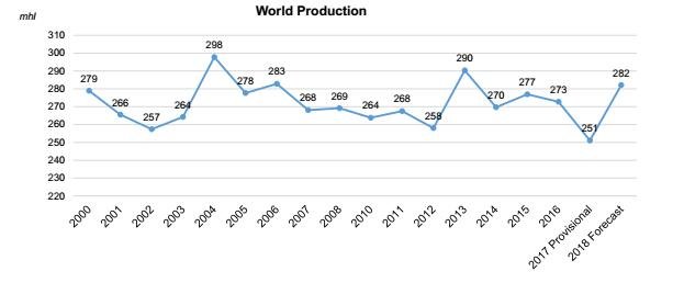 2017年全球葡萄酒產量下降8.2%,為近50年來最低值,而2018年產量將大幅提升,預計為282億升(mhl)。