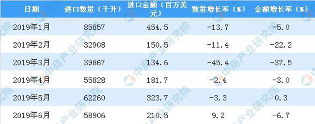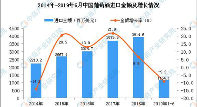 2019年1-6月中國葡萄酒進(jìn)口數(shù)量及金額增長率情況
