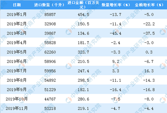 2019年1-11月中國葡萄酒進(jìn)口數(shù)量及金額增長率情況